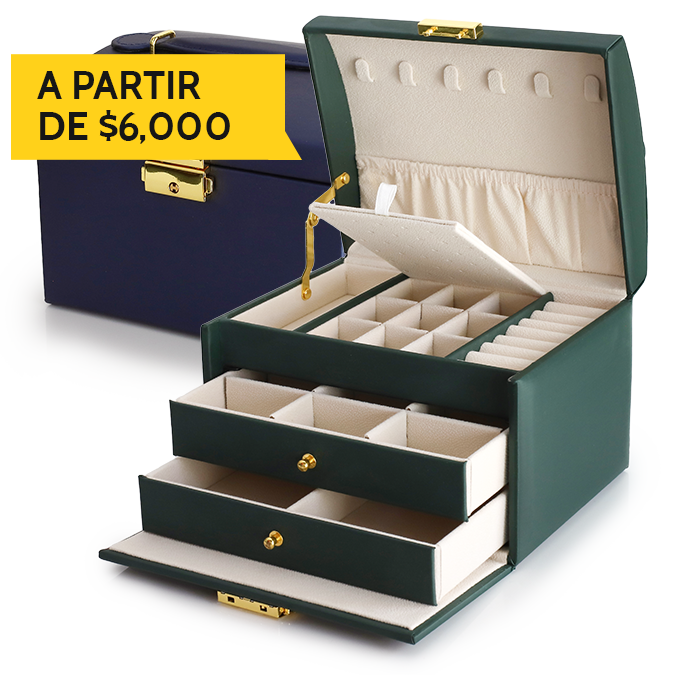Obtén un joyero chico de regalo a partir de $2,500 o un joyero jumbo a partir de $6,000 en joyería, excluyendo compra de suministros (Joyeros, Cajas, Bolsas Ziploc, etc). Descubre qué joyero recibirías según el monto de tu compra.